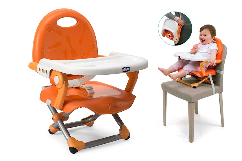 Kindersitz "Pocket Snack" leichte, kompakte, klappbare Sitzerhöhung mit abnehmbarer Tischplatte, 3-fach höhenverstellbar, zum Stellen auf Stühle, mit Befestigungsgurten, ist für Kinder bis 15kg geeignet Farbe: orange