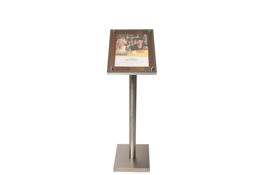 Panneau d'affichage noyer 1xA4 28 x 37 x 3 cm en bois dur, bordures en acier, verre de sécurité, pour intérieur et extérieur, montage au mur ou sur pied vis/chevilles incl.